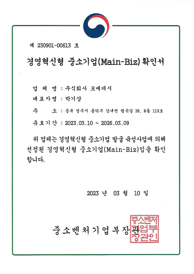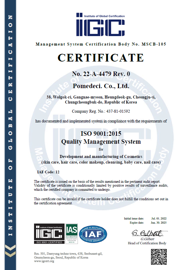 Pomedeci has obtained certifications for skincare, hair care, color cosmetics, cleansing, baby care, and nail care product development and manufacturing management.
